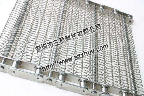 10.鏈條式網(wǎng)帶:由鏈條驅(qū)動的輸送網(wǎng)帶一般都由鏈條帶動小軸再帶動網(wǎng)帶運(yùn)行。 網(wǎng)帶都采用軋牙串條、左右網(wǎng)條二根串,并大小網(wǎng)條連接而成,大網(wǎng)條內(nèi)穿進(jìn)小軸,小軸二端穿入鏈條孔,從而達(dá)到鏈條驅(qū)動輸送網(wǎng)帶。鏈條網(wǎng)傳動平穩(wěn)、傳動力矩小。11,U型鏈條網(wǎng)帶,也可作為螺旋式網(wǎng)帶,采用進(jìn)口電腦網(wǎng)帶機(jī)生產(chǎn),網(wǎng)面強(qiáng)硬耐用,不易變形。最大特點(diǎn)是轉(zhuǎn)彎性能好,可以實(shí)現(xiàn)180度的轉(zhuǎn)彎,且運(yùn)行平穩(wěn)。具有網(wǎng)面平整,可承載較重的壓力和拉力。通風(fēng)透氣性能好,網(wǎng)面潔凈無毒,而且容易清洗。維修和拆卸極為方便。可根據(jù)客戶要求在網(wǎng)帶兩側(cè)加裝擋邊。